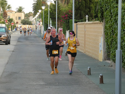 La subida de 700 metros la hago debidamente, a pleno rendimiento, una autentica rompepiernas pero que llevaba perfectamente entrenada. Siguen las cuestas y a ritmo la hago seguida sin problemas. Llegar a la catedral fue un alivio aprovecho las vistas que me ofrecía la fachada de la catedral con el sol en todo lo alto, estas estampas procuro vivirlas a tope. A partir de aquí Avenida Madrid en descenso controlando pero dando un puntito de velocidad, a partir de aquí se que voy a terminar perfecto, porque lo demás era "lo menos malo". Los otros dos kilómetros en llano fueron muy bien, no noté gran desgaste y cuando quise darme cuenta ya estaba en el kilómetro 15, no había marcadores kilométricos y los avituallamientos estaban irregularmente repartidos. La cuesta de 800 metros que me esperaba era de 400 se ve que el vaivén alrededor de una parte de la zona residencial era únicamente para completar los 11 kilómetros de la primera vuelta y que en la segunda fueran solo 10 para hacer así 21 kilómetros de la Media Maratón.